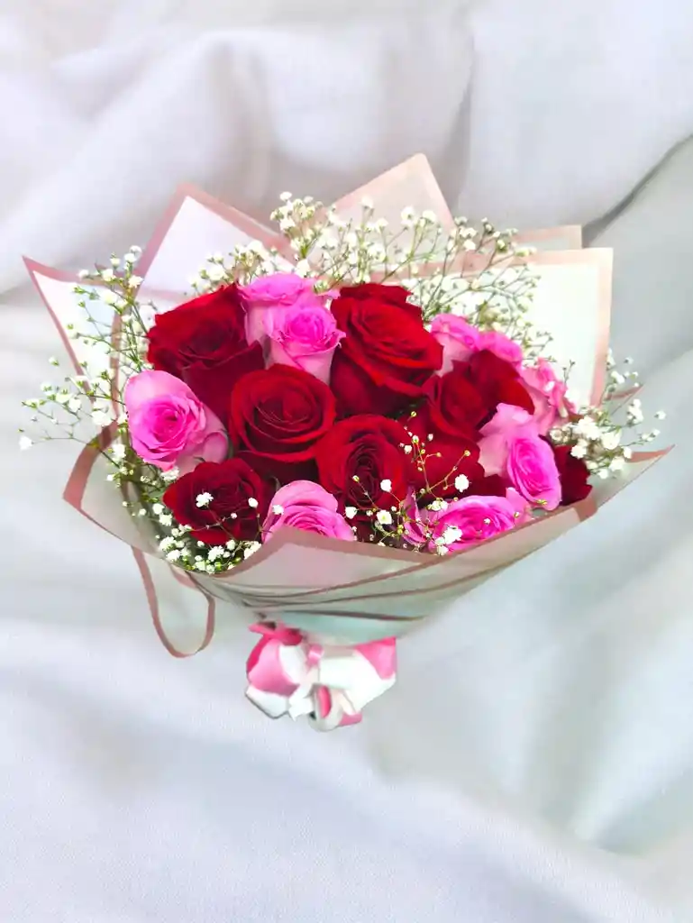 15 ROSAS SEGUN DISPONIBILIDAD DE COLOR CON GIPSOFILIA Y ENVUELTA EN PAPEL COREANO ( COLOR DE PAPEL SEGUN DISPONIBILIDAD) Y MOÑO
