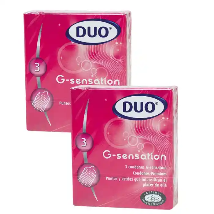 Principales Beneficios: • Brinda una excitante sensación caliente • Lubricante especial a base de silicona • Comprobado electrónicamente uno a uno • Forma anatómica fácil de poner • Los condones Duo ayudan a prevenir el embarazo • Los condones Duo ayudan a reducir el riesgo de infecciones transmitidas sexualmente como el VIH/SIDA 3 condones G-sensation condones premium punto y estrias que intensifican el placer de ella