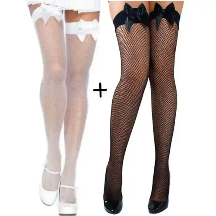 *2 Medias De Malla Con Moño Sexy Blanca Y Negra Lenceria De Encaje: Medias en malla con moño media pierna (se puede utilizar el moño adelante o atrás). Las medias son un plus de sensualidad para tus prendas perfectas para complementar tu lencería o disfraz favorito. Lúcete con tu pareja.. CARACTERÍSTICAS DESTACADAS Material: nailon y elastano. Talla: única (para adulto) Medias de malla con moño (se puede usar el moño adelante o atrás). -Incluye 2 Pares De Medias: 1 Blanca y 1 Negra.