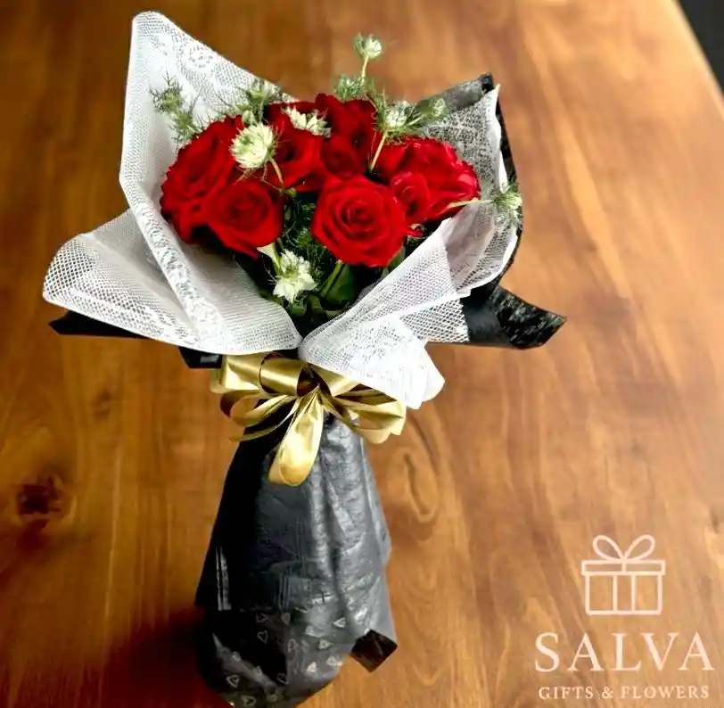 24 Rosas Rojas envueltas en texturas de lujo y Moño, Bouquet de rosas rojas, incluye follajes y complementos.