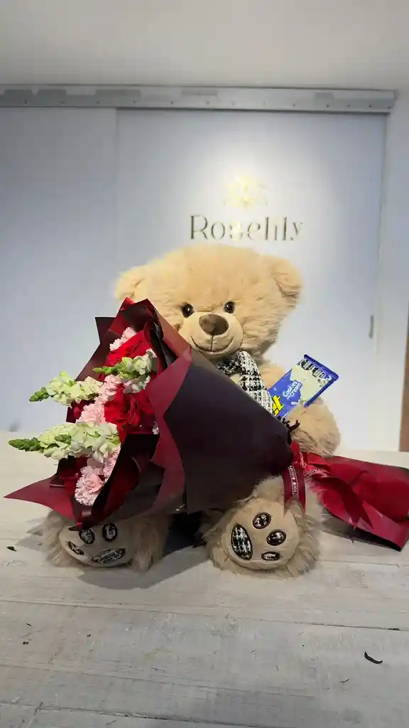 Este diseño es la personificación del cariño y la compañía. En Roselily, hemos creado Abrazo de Ternura para esos momentos donde las palabras no bastan y se necesita un gesto que se pueda abrazar. Es una experiencia que combina la pasión de nuestras flores con la calidez de un amigo de felpa y un detalle dulce, creando un recuerdo que perdura mucho después de que el día ha terminado.