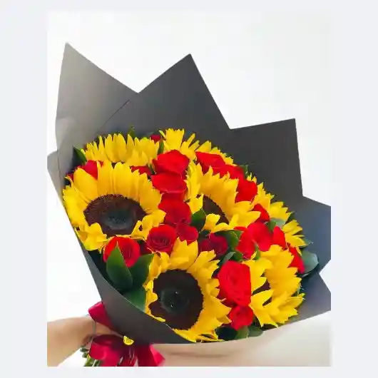 Bouquet con aprox. 7 girasoles 24 rosas rojas y rusco. Nota: La flor puede ser sustituida dependiendo la disponibilidad de color y del producto “Mensaje Personalizado” máximo de 30 caracteres (Dejar el mensaje en el chat, los comentarios no se previsualizan para la tienda por lo que si se dejan allí no podrá ser incluido).