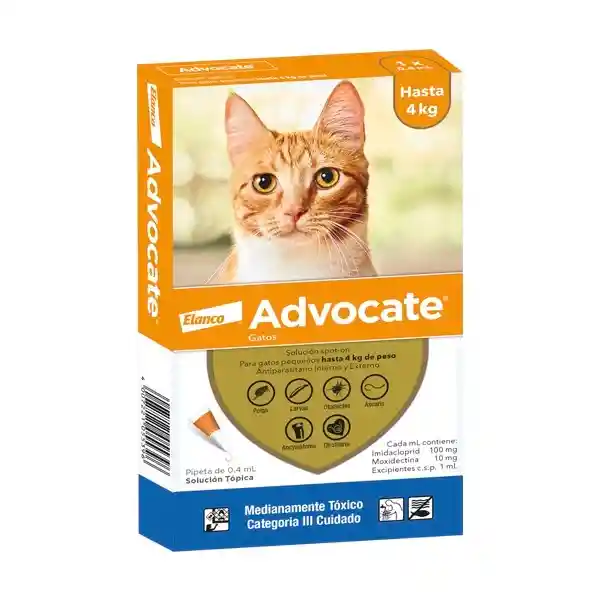 Advocate Gatos es el antiparasitario en pipeta para mascotas más completo del mercado, ofreciéndoles una protección superior contra los principales parásitos externos e internos. Advocate Gatos es usado para el tratamiento y control de las pulgas Ctenocephalides spp., tratamiento de la infestación por el ácaro del oído Otodectes cynotis, tratamiento de la demodicosis causada por Demodex cati, Notoedres cati, control de la infestación por el parásito del corazón Dirofilaria immitis, larva L3 y L4, tratamiento de las infestaciones por nemátodos gastrointestinales: larva L4, adultos inmaduros y adultos de Toxocara canis, Ancylostoma caninum y Uncinaria stenocephala y adultos de Toxascaris leonina y Trichuris vulpis.