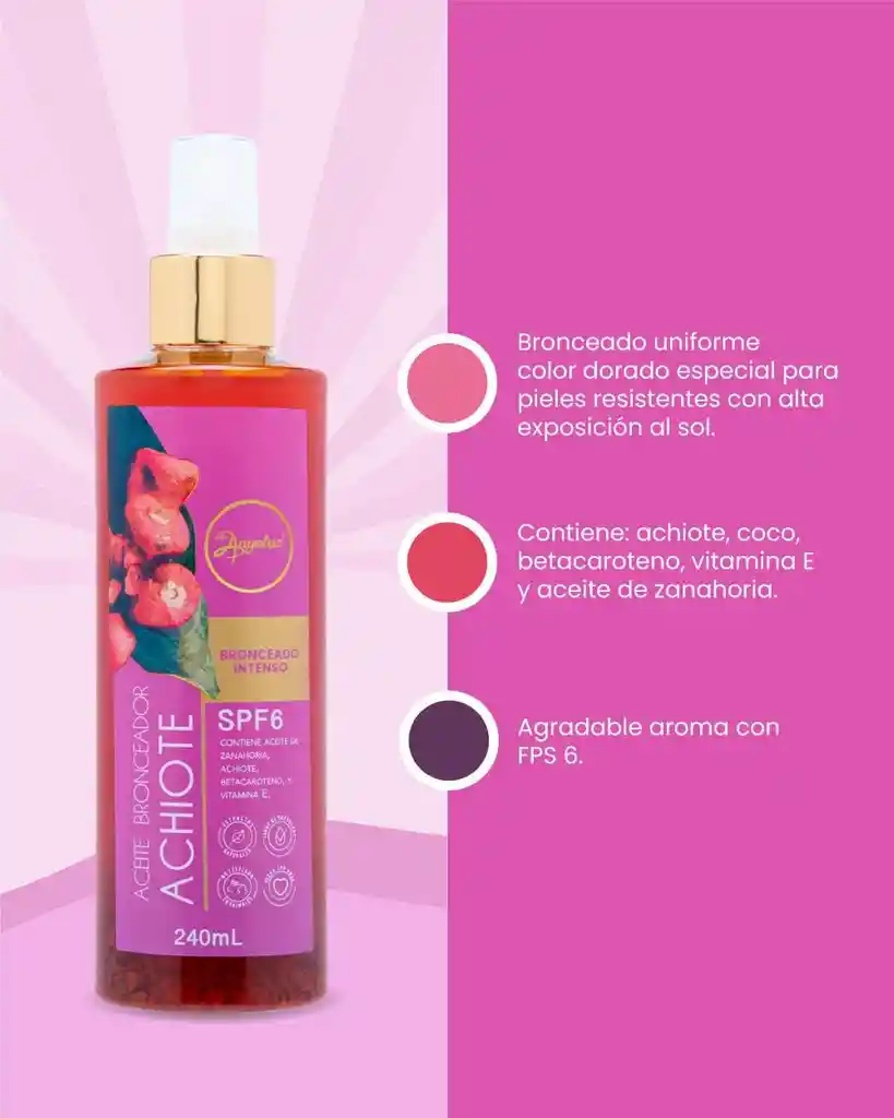 ACEITE BRONCEADOR DE ACHIOTE SPF6 ANYELUZ 240 ML : Broncea tu piel de forma uniforme dejando un tono dorado con un agradable aroma. Gracias a sus componentes el Bronceador de Achiote protegerá tu piel y la humectará durante la exposición al sol. Contiene filtros solares. Ideal para pieles muy resistentes al sol. Contiene canela, achiote, coco, betacaroteno, vitamina E y aceite de zanahoria. Modo de uso Aplicar antes de la exposición solar y renovar la aplicación al menos cada dos horas o cuando se desee. Después de haber ingresado al agua (piscina, mar o ducha) se debe secar bien la piel y aplicar el bronceador Anyeluz nuevamente. Precauciones Se recomienda el uso de bloqueador solar y geles refrescantes. Se recomienda el uso de vestidos de baño o ropa negra u oscura para usar el bronceador de Achiote. Evitar la sobre exposición al sol, seguir las indicaciones de uso. En caso de una reacción adversa suspender su uso y consultar con el médico o dermatólogo de confianza. Sólo para uso externo.