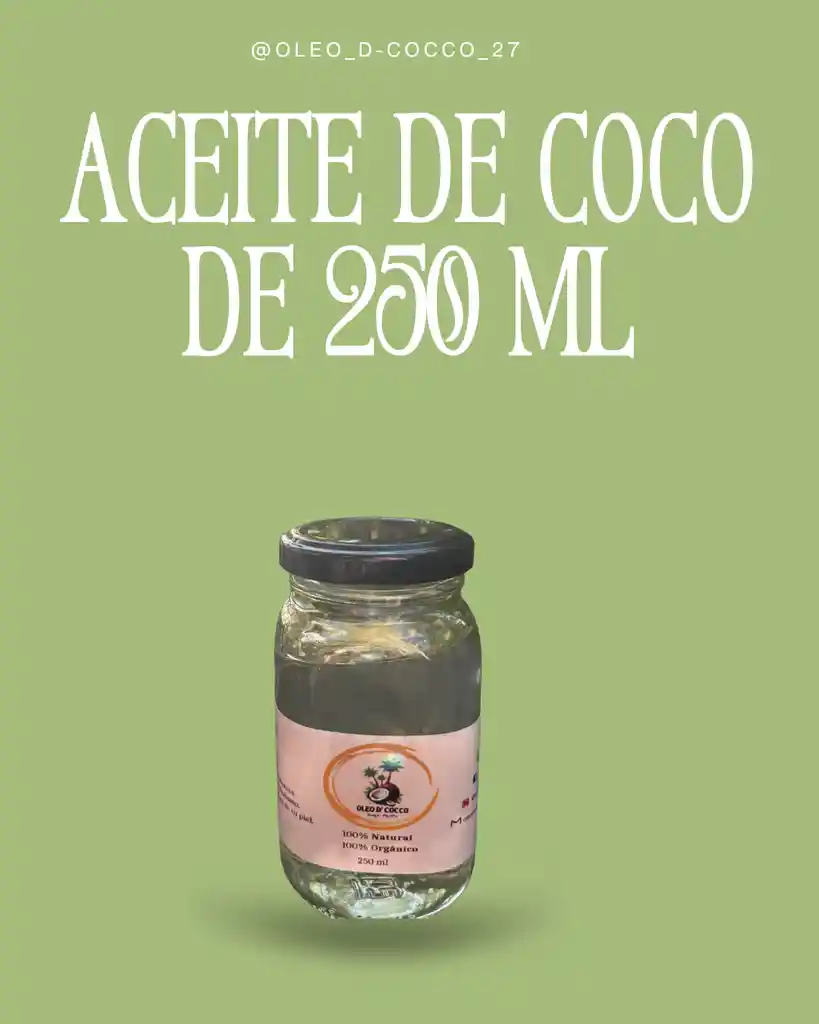 Aceite De Coco Oleo D Cocco 100% Natural Y Orgànico 250 Ml