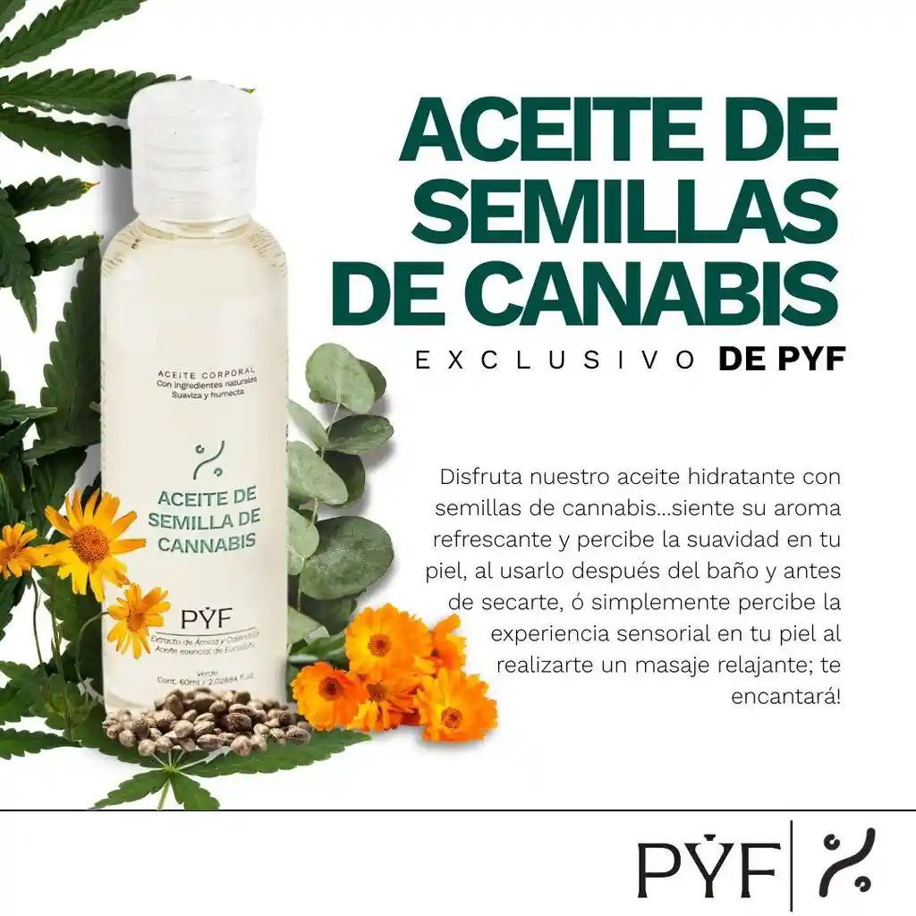 ACEITE DE SEMILLAS DE CANABIS, EXTRACTO DE ARNICA, CALENDULA, ACEITE ESENCIAL DE EUCALIPTO. IDEAL PARA MASAJES REALJANTES HIDRATA LA PIEL Y CREA EXPERIENCIAS SENSORIALES OLFATIVAS CON SU AROMA FRESCO