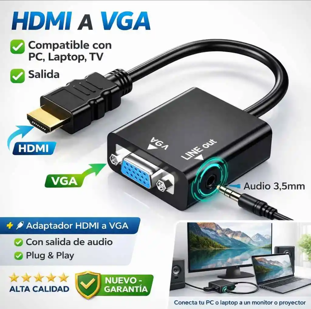 🔌 Adaptador HDMI a VGA con salida de audio Convierte la señal de HDMI a VGA de forma rápida y sencilla. Ideal para conectar tu laptop o PC a monitor, proyector o pantalla VGA. Incluye salida de audio auxiliar 3.5mm para conectar parlantes o audífonos. ✔ HDMI a VGA ✔ Salida de audio 3.5mm ✔ Compatible con PC, laptop, monitor y proyector ✔ Plug & Play (no requiere drivers) ✔ Tamaño compacto y fácil de transportar ⚠️ Funciona solo de HDMI a VGA (no bidireccional). 🔹 Cable VGA no incluido. 🆕 Producto nuevo, buena calidad.