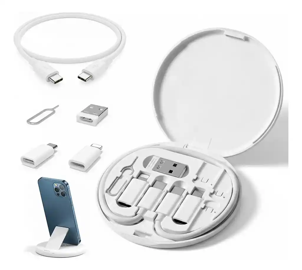 El paquete de carga multifuncional 5 en 1 es un kit portátil diseñado para brindar energía y conectividad en cualquier momento. Permite cargar smartphones, tabletas, computadoras portátiles y otros dispositivos gracias a su cable tipo C de 60 W que admite carga rápida. Además, la caja de almacenamiento circular puede funcionar como soporte para teléfono o tableta, liberando tus manos durante su uso. Su diseño compacto y ligero permite transportarlo fácilmente en bolsillos, mochilas o bolsas de computadora, siendo ideal para viajeros y entusiastas de la tecnología. Especificaciones destacadas Tipo de conector: USB-A, USB-C, Tipo C, Micro USB Dispositivos compatibles: teléfonos inteligentes, tabletas, computadoras portátiles, auriculares, entre otros Carga rápida: cable tipo C de 60 W Función adicional: la caja actúa como soporte para teléfono o tableta Tamaño: 8,3 × 1,2 cm Peso: 55 g Color: Blanco