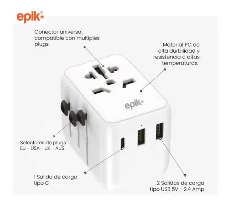 Adaptador universal de viaje Epik 1500W. Compatible con múltiples enchufes internacionales. Ideal para viajes y uso doméstico.