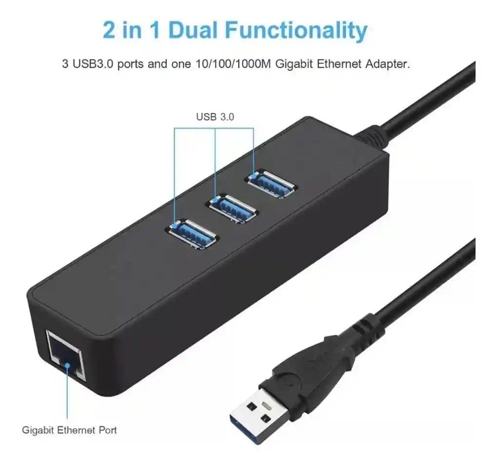 Multipuerto 3,0 Hub Adaptador Red Este adaptador es perfecto para mejorar la conectividad de su equipo, especialmente útil para quienes necesitan más puertos USB y una conexión de red rápida y estable. DESCRIPCIÓN El adaptador USB a Ethernet incluye 3 puertos USB y un puerto RJ45 de 100 Mbps (conectarse a ordenadores sin puertos de red). Puede expandir fácilmente los puertos en computadoras portátiles, computadoras PC y otros dispositivos. Transmisión de alta velocidad -- Este adaptador Ethernet RJ45 USB 3.0 proporciona 3 puertos USB 3.0 adicionales para conectar varios dispositivos periféricos USB, como unidades flash, discos duros, teclados, ratones, impresoras, etc. Velocidad de transferencia de hasta 5 Gbps, 10 veces más rápido que el puerto USB 2.0 original. También puede transferir películas de alta definición en unos segundos. CARACTERÍSTICAS * Tres puertos USB 3.0 adicionales. * Puerto Ethernet RJ45 de 100 Mbps. * Expansión fácil de puertos en dispositivos. * Compatible con portátiles y PCs. * Velocidad de transferencia de hasta 5 Gbps. * Transmisión rápida. * Conexión de múltiples periféricos USB. * Compatible con unidades flash y discos duros. * Compatible con teclados y ratones. * Ideal para impresoras y otros dispositivos USB. MEDIDAS Largo: 25,5 cm Ancho: 2,5 cm Alto: 2,5 cm Peso: 38 g QUE INCLUYE LA COMPRA X1 Multipuerto 3,0 Hub Adaptador Red USB
