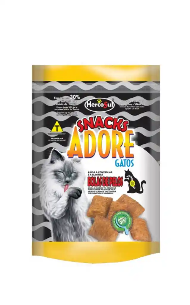 ADORE SNACKS GATOS es un delicioso bocado que además de muy sabroso es rico en ACEITES + FIBRAS para proporcionar la eliminación y reducir la formación de pelotas de pelos de forma natural y segura, en TAURINA para ayudar a mantener la salud cardiaca y de la visión,y para completar, contiene EXTRACTO DE YUCCA para reducir el mal olor de las heces y orina de su gato.