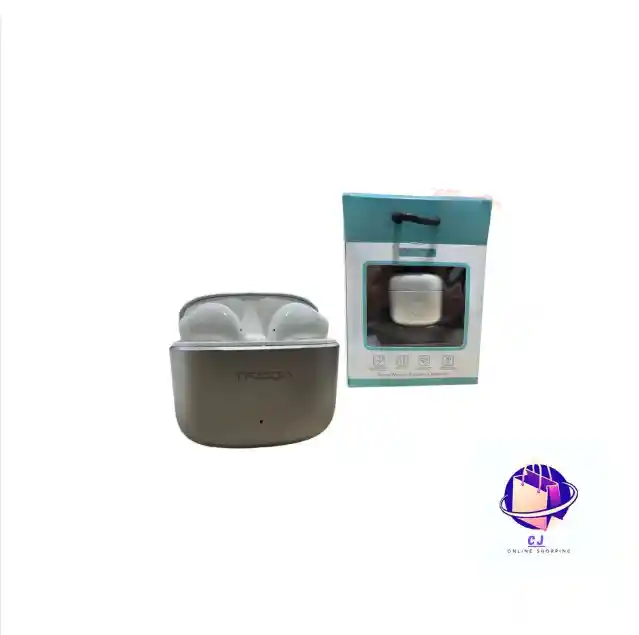 Audífonos inalámbricos Airpob con interior color blanco y exterior color plateado, sin cable y de excelente calidad. Diseño cómodo y práctico, ideal para escuchar música y atender llamadas con libertad de movimiento.