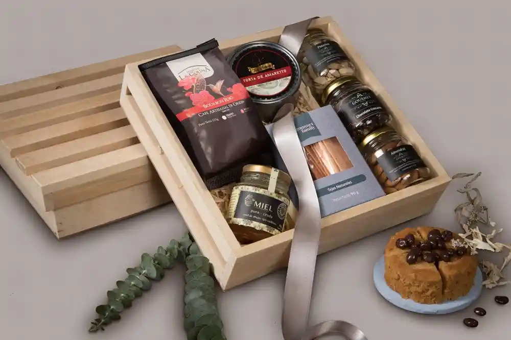 Café 100% colombiano (125g), miel artesanal (130ml), torta de amaretto (150g), tejas naturales (90g), almendras (40g aprox), chocolate crocante (40g aprox) y pistachos con sal (40g aprox).