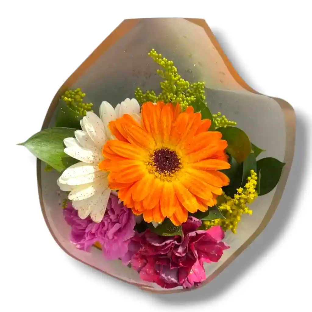 2 GERBERAS Y 2 CLAVELES (COLOR SEGUN DISPONIBILIDAD) CON FOLLAJE VERDE Y AMARILLO ENVUELTOS EN PAPEL COREANO (COLOR DE PAPEL SEGUN DISPONIBILIDAD) Y LAZO DE CINTA