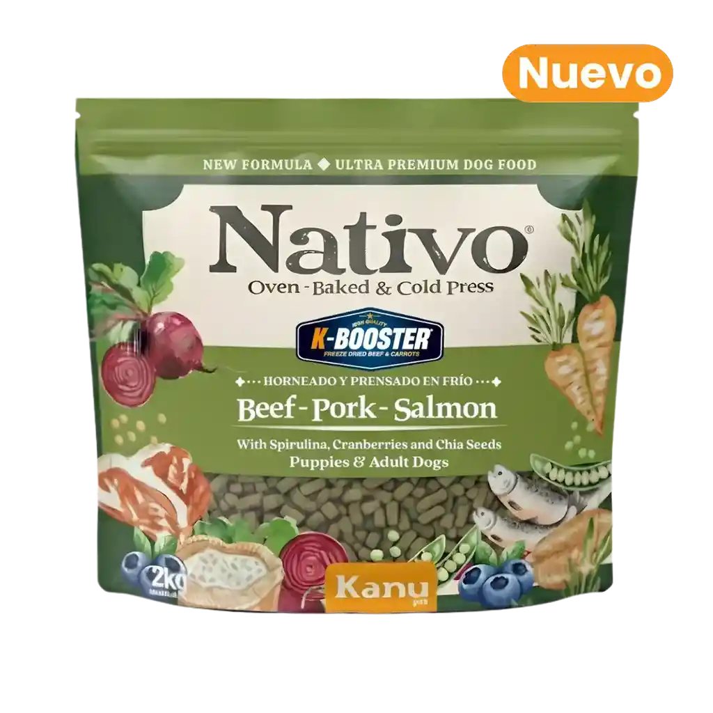 Nativo Oven-Baked de Kanu Pet es un alimento ultra premium horneado y prensado en frío, diseñado para quienes buscan una nutrición natural, real y sin rellenos. Su proceso artesanal conserva intactos los nutrientes y el sabor auténtico de la carne, vísceras y salmón. Cada croqueta ofrece proteínas funcionales y omegas naturales que fortalecen los músculos, la piel y el pelaje, mientras la nuez de sacha inchi, los arándanos y la espirulina aportan antioxidantes, refuerzan las defensas y promueven vitalidad. Enriquecido con probióticos activos, minerales orgánicos y colina natural, mejora la digestión y la absorción de nutrientes. Además, su toque de K-Booster, elaborado con pulmón de res y zanahoria liofilizados, eleva la palatabilidad y realza el aroma natural del alimento. Ideal para tutores que valoran una dieta sin rellenos, sin saborizantes y científicamente formulada para el bienestar de su mascota.