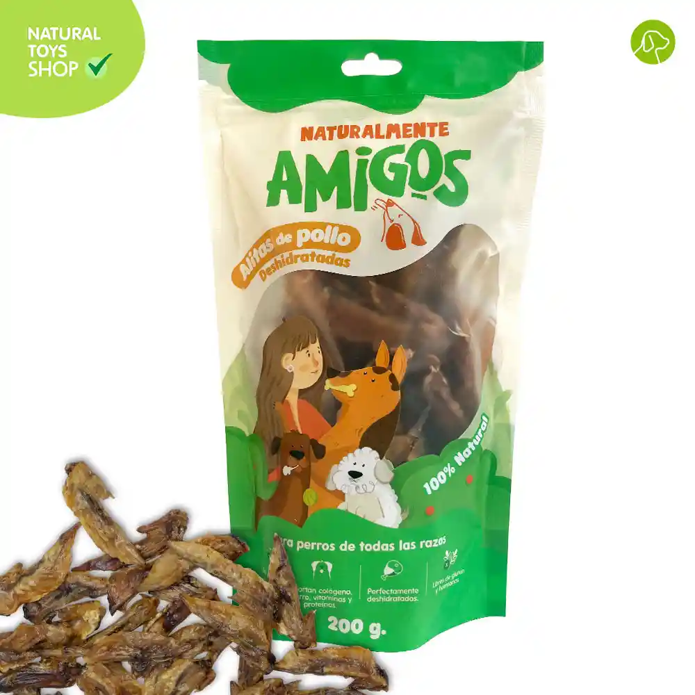Exquisitas y Crocantes Alitas (Wingz) de Pollo para tu perro. Nuestras Wingz son naturales, están deshidratadas y cuentan con un proceso en el que eliminamos todo tipo bacterias Son reales, No Carnaza 100% Pollo cada Alita conserva el sazón que obtiene de la piel del pollo. Tienes que tenerlas para que tu mascota disfrute el Cronch y delicioso sabor a Wingz. También: - Sin conservantes ni Preservativos químicos. - Sin bacterias. - Sanos para su organismo y digestión. Tiempo máximo de consumo 12 meses. El producto está listo para su consumo, una vez abierto se recomienda consumirlo en el menor tiempo posible. Almacenar el producto en su empaque original a temperatura ambiente, en un lugar seco y fresco. Evitar que el producto quede expuesto en lugares donde hay bichos y moscas que se le pueden prender y a su vez contaminarlo. Notas: * Ideal para Perros de todas las razas con más de 6 meses de edad. * Razas medianas y grandes 3 unidades al día. * Razas pequeñas 2 unidades al día. Son Snacks Naturales para Mascotas, Snacks Naturales ideales para Perros, sirve como complemento del alimento para perros, comida para perros, es un complemento nutricional para mascotas. Comestibles Naturales para mascotas. Comestibles para perros. Se usa como comida para mascotas por los beneficios adicionales que contiene pero No reemplaza la comida tradicional. Somos Natural Toys: Snacks, Deshidratados y Huesos Naturales para Mascotas. "Del campo al paladar de tu mascota”