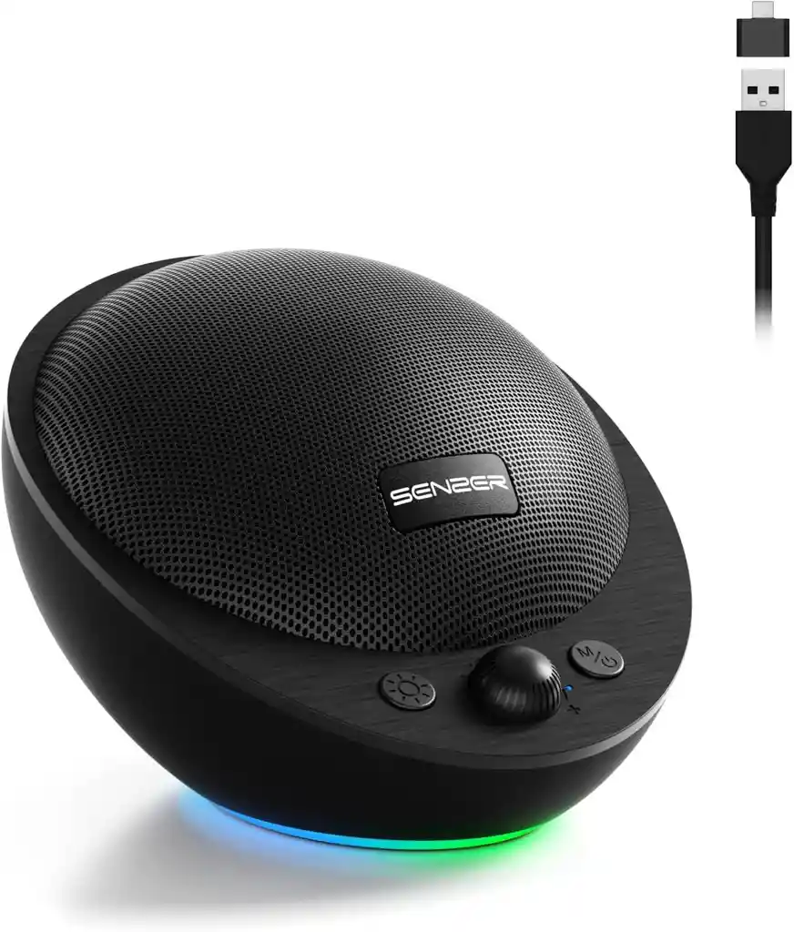 [Mini diseño portátil: dimensiones de 5.4 x 4.5 x 3.3 pulgadas, diseñado para maximizar la eficiencia del espacio, nuestro altavoz portátil está diseñado para adaptarse perfectamente a la configuración, no solo ahorra mucho espacio, sino que también hace que sea fácil de transportar y usar en cualquier momento y en cualquier lugar. [Varios efectos retroiluminados]: 5 efectos LED retroiluminados diferentes: círculos de colores variados - fluyendo - cambio de color único - seleccionar color sólido - luz apagada. Puedes hacer clic en el botón de iluminación para personalizar la retroiluminación para adaptarse a tu configuración y vibraciones.