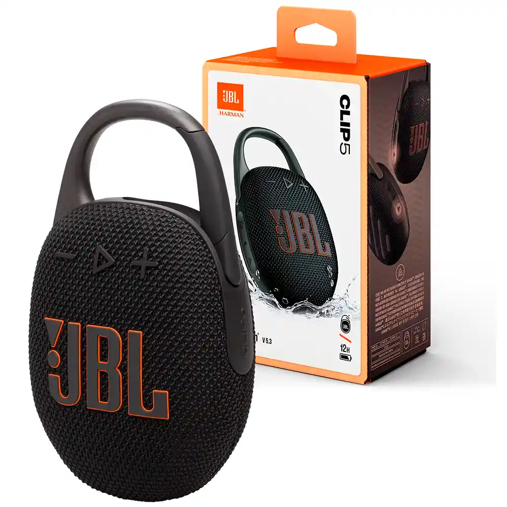 Sonido JBL Pro ultraportátil No dejes que su pequeño tamaño te engañe. El JBL Clip 5 brinda una excelente experiencia musical, ofreciendo un gran sonido JBL Pro con graves impactantes. Tus amigos no se van a creer que un sonido tan potente pueda salir de un altavoz JBL Pro tan pequeño. Mosquetón rediseñado El mosquetón, completamente rediseñado e integrado, tiene una abertura mucho más ancha que lo hace aún más portátil. Puedes enganchar el Clip 5 en cualquier sitio, desde la mochila hasta la trabilla del cinturón, y llevar tu música contigo todo el día y a todas partes. Hasta 12 horas de reproducción más 3 horas extra con Playtime Boost No te preocupes por cosas sin importancia como cargar la batería. El Clip 5 te da hasta 12 horas de tiempo de reproducción con una sola carga. Solo tienes que pulsar Playtime Boost para prolongar el tiempo de reproducción y aumentar la duración de la batería hasta 3 horas. Esta función sintoniza y optimiza el rendimiento para obtener un sonido más alto y nítido. Especificaciones: Características generales Potencia de salida: 7 Características Audio Respuesta de frecuencia dinámica: 95 Hz - 20 kHz Características de control y conexión Perfiles Bluetooth: A2DP 1.4, AVRCP 1.6 Rango de frecuencia de transmisión Bluetooth: 2400MHz - 2483.5 MHz Transmisión de modulación GFSK vía Bluetooth: GFSK, π/4 DQPSK, 8DPSK Potencia de transmisión Bluetooth: ≤ 10dBm (EIRP) Versión Bluetooth: 5.3 Batería Tiempo de carga (horas): 3 Tiempo de reproducción de musica: 15 Garantía: 12 Meses