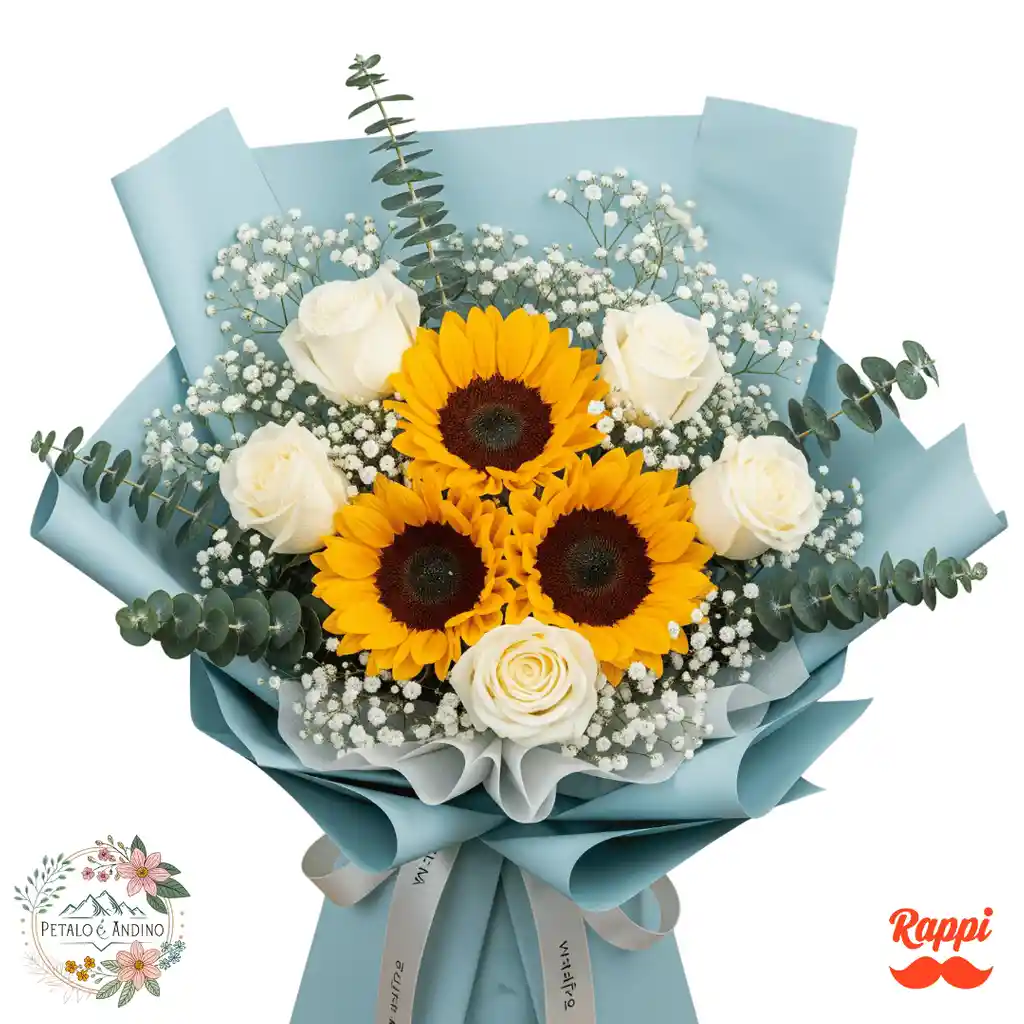 3 girasoles 5 rosas blancas 4 ramitas de gipsófila blanca 3 ramas de eucalipto