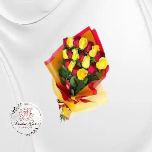 Un encantador ramo de 18 rosas bicolor rojo y amarillo que simbolizan alegría, pasión y energía positiva. un amanecer lleno de vida y emociones. Su diseño es ideal para Detalles románticos con un toque original, Celebraciones especiales o días festivos, Regalos para amigos o pareja que inspiran felicidad.