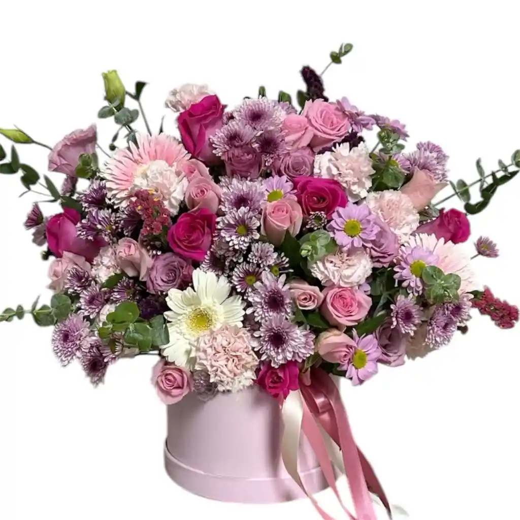 Arreglo en base cilíndrica blanca compuesto por rosas surtidas en tonos lila, rosado, fucsia y blanco, acompañadas de claveles, margaritas, clavellina y eucalipto natural. Decorado con un delicado lazo, es un diseño elegante y armonioso, perfecto para celebrar momentos especiales con color y sofisticación.