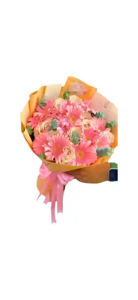 Bouquet de gerberas rosadas con rosas y eucalipto