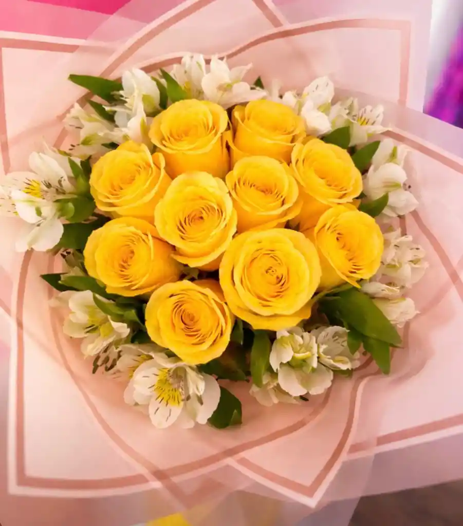 Ramo de 10 rosas amarillas mas astromelias y papel coreano