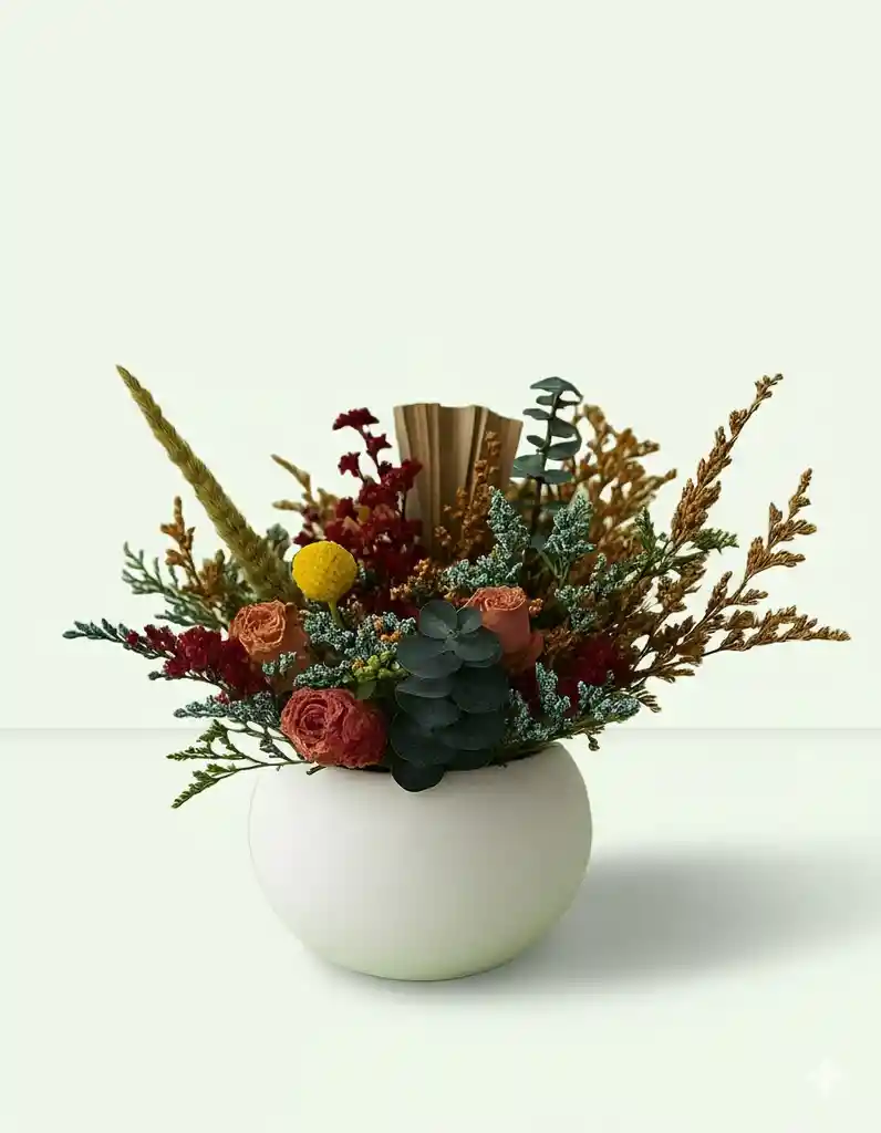 "Arreglo artesanal de flores y follajes secos que celebra los tonos cálidos de la tierra. Combina texturas suaves como la pampas, Palma, Rosas, detalles rústicos en hojas secas y acentos vibrantes en amarillos, verdes, rojos. Su diseño orgánico y equilibrado lo convierte en una pieza ideal para espacios modernos, acogedores y llenos de estilo. Perfecto para dar un toque natural y a cualquier ambiente. Incluye jarron en ceramica blanca