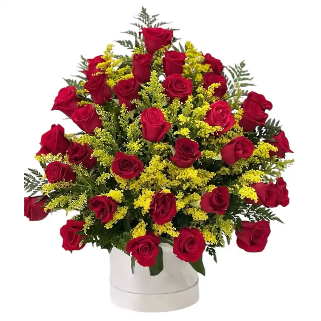 Elegante diseño en base cilíndrica mediana compuesto por 30 rosas rojas frescas, acompañadas de soliaster y follaje verde natural. Un arreglo sofisticado y romántico, ideal para sorprender con un detalle impactante y lleno de pasión.