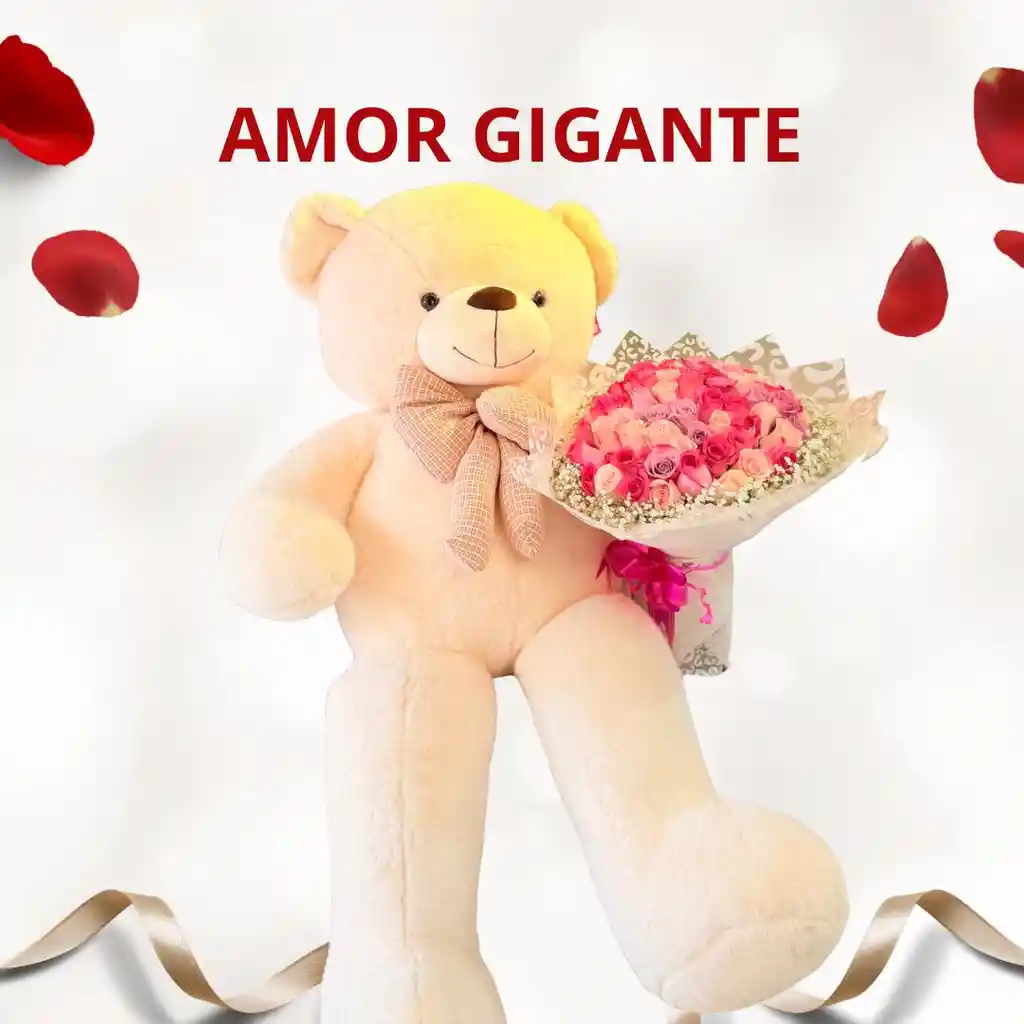 PELUCHE GIGANTE ACOMPAÑADO DE RAMO DE ROSAS (COLOR SUJETO A DISPONIBILIDAD)