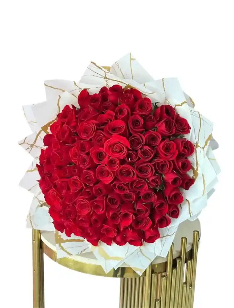 Ramillete compuesto por 100 rosas rojas frescas, envuelto en elegante papel coreano y terminado con un delicado lazo. Un detalle majestuoso y profundamente romántico, perfecto para declaraciones de amor inolvidables y ocasiones extraordinarias.