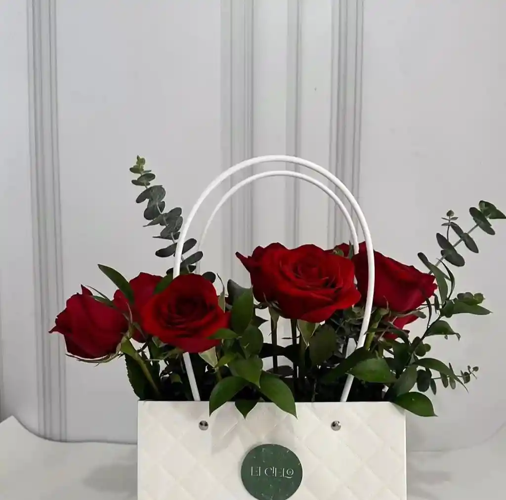Bolso multicolor con 12 rosas rojas y eucalipto de monedita