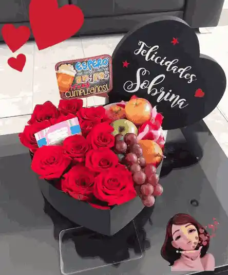 Contenido: 1 Corazón Negro en Figura 12 Unid de Rosas Rojas Mitad del corazón Frutal 3 Manzanas 1 Ramo de Uvas 1 kiwis 1 Tarjeta personalizada
