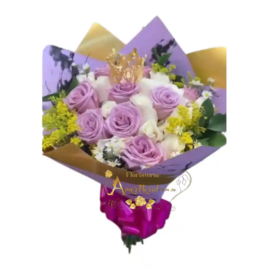 BOUQUET POR 24 ROSAS, MIN CORONA METALIZADA, si deseas un mensaje para la tarjeta lo puedes dejar escrito en el área de observaciones o escribirnos al whatsapp al 3143111616 y enviarnos el mensaje para la tarjeta.