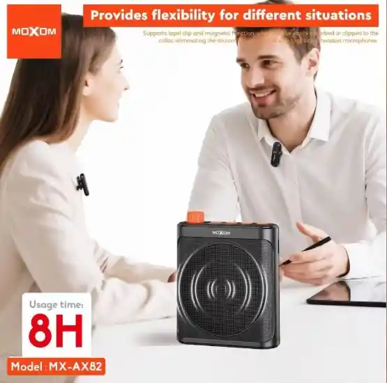 Amplificador de voz magnético inalámbrico de solapa MOXOM MX-AX82 Versión inalámbrica: 5.2 Capacidad: 80 mAh + 80 mAh + 2000 mAh Estándar de carga: 5 V/1 A Tiempo de carga: 2 h Tiempo de uso: 6-8 h Sensibilidad: -49dB Relación señal/ruido: 52dB Respuesta de frecuencia: 20 Hz-20 kHz Frecuencia de transmisión: 2402-2480 MHz Alcance de transmisión: 10M EDR:+6DB