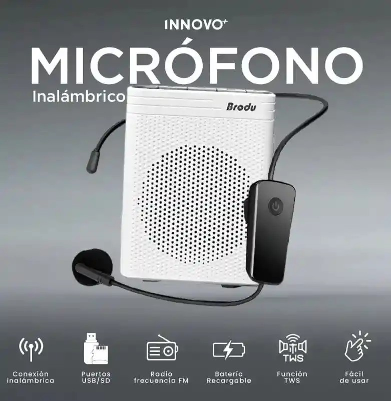 ¡Haz que tu voz se escuche con claridad y sin esfuerzo! ¿Cansado de forzar la garganta en clases, tours o presentaciones? El Amplificador de Voz Profesional Innovo+ es tu aliado perfecto. Diseñado para ofrecer una potencia sorprendente en un tamaño compacto, este dispositivo te permite moverte libremente gracias a su tecnología inalámbrica de última generación. ¿Por qué elegir este amplificador? Libertad Total 2.4G: Olvídate de los cables estorbosos. Incluye una diadema con micrófono inalámbrico de largo alcance y conexión estable (anti-interferencia). Batería de Larga Duración: Su batería de 1200mAh te acompaña durante toda tu jornada laboral sin interrupciones. ¡Cárgalo y listo! Mucho más que un megáfono: Cuenta con conectividad Bluetooth 5.0, entrada para USB, tarjeta TF (Micro SD) y Radio FM. ¡Incluso puedes grabar tus sesiones! Sonido de Alta Fidelidad: Gracias a su sistema de reducción de ruido y función TWS, obtendrás un audio nítido y profesional. Diseño Ultra-Portátil: Incluye un clip de cinturón resistente para que lo lleves cómodamente mientras mantienes tus manos libres.