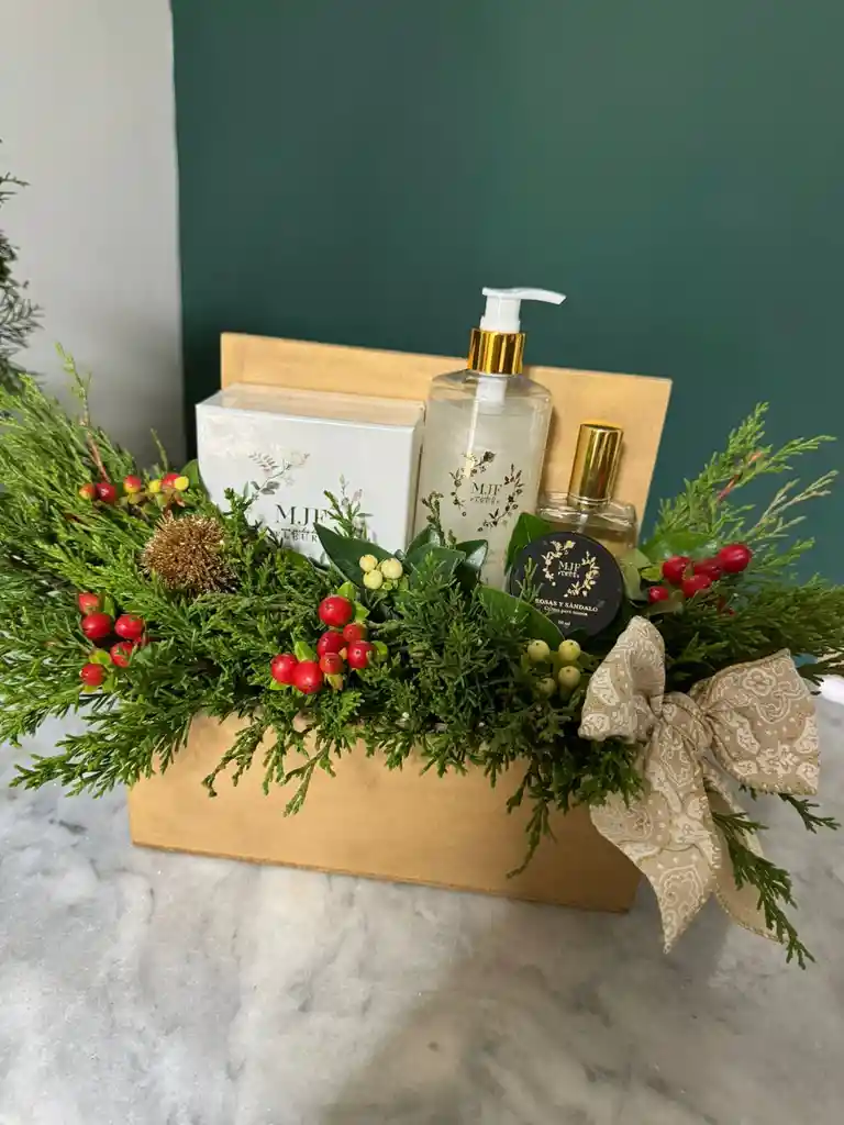 Bual M con pino y decoracion navideña. Kit Aroma Jabon de manos, Agua de lino, crema de manos y vela