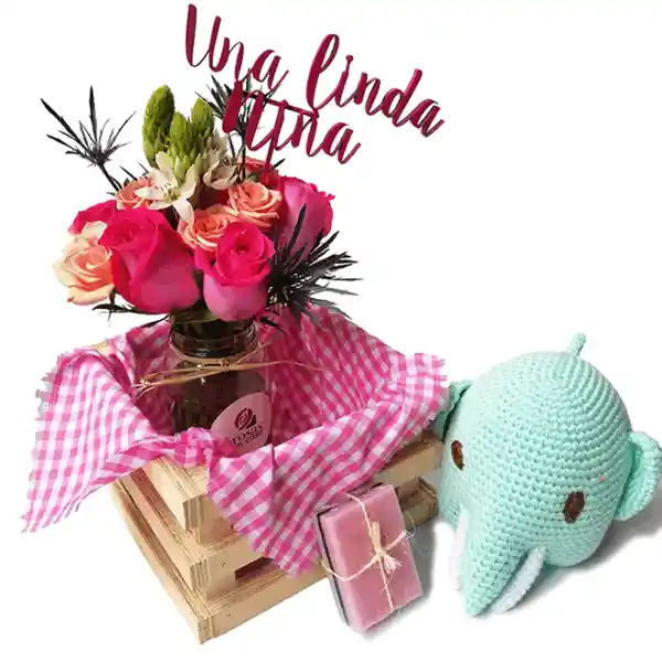 Ancheta Para Nacimiento de Bebé, Compuesto Por Arreglo Floral Con Rosas y Follajes en Frasco Tipo Conservas, Muñeco Unicornio, Jabón de Rosas, Caja Decorativa , Mantel y Letrero "Una Linda Niña" en Madera Pintado