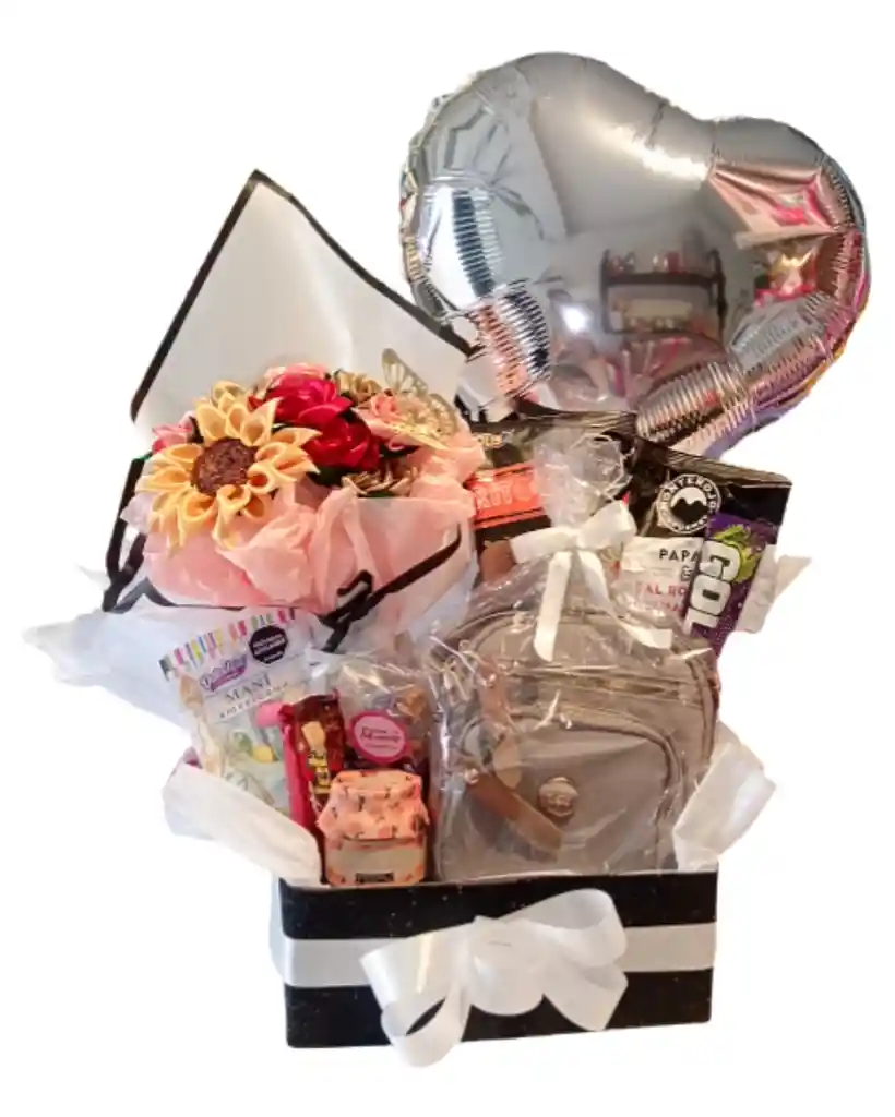 una fabulosa ancheta para regalar en el dia de la madre o para cumpleaños , contiene un bolso manos libres en color caqui, comestibles incluidos chocolates, una vela aromatica, y es expectacular ramo de rosas eternas , incluye tambien tu mensaje personal y un lindo empaque