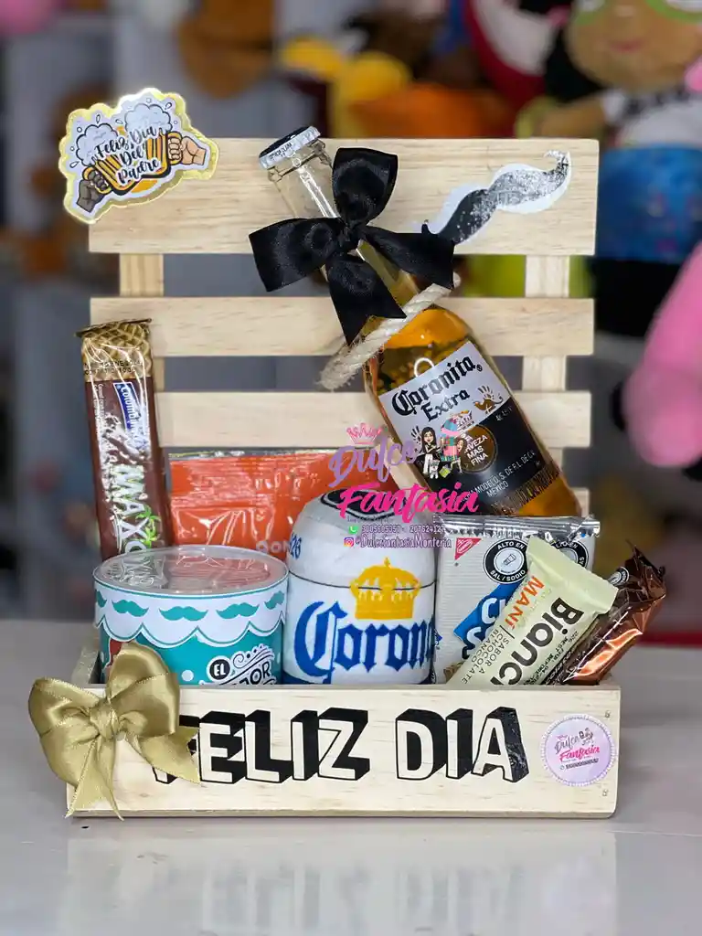Ancheta Caja de madera Cerveza coronita Dulces surtidos Papá pringles Peluche llavero