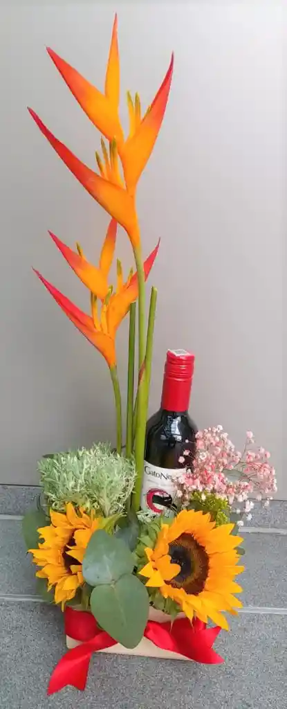 CAJA, VINO GATO NEGRO, GIRASOLES, FOLLAJE, AVE DEL PARAISO