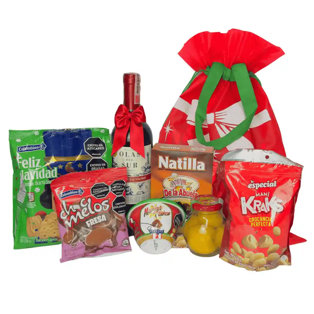 “Conexión Real” es una ancheta empresarial navideña diseñada para sorprender con un regalo completo, tradicional y elegante; incluye un vino tinto de 750 ml 🍷, galletas navideñas 🍪, natilla lista para disfrutar, maní crocante, duraznos en almíbar 🍑, manjar dulce, masmelos cubiertos y un hermoso empaque en bolsa ecológica que resalta la presentación y cuida el medio ambiente. Es un detalle ideal para clientes, colaboradores o familias que desean un obsequio abundante y representativo de la temporada. Te podemos obsequiar una tarjeta si nos envías el mensaje para que acompañes tu detalle.