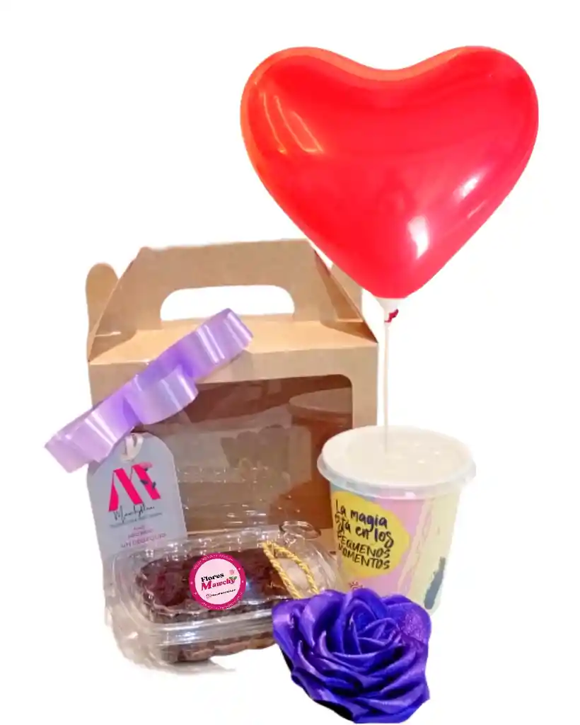 hermosa ancheta para celebrar un dia y convertilo en especial , contiene 1 cafe late de 9oz 1 brawnie de chocolate 1 llavero de rosa 1. tarjeta con tu mensaje personal 1 globo de corazon o de cumpleaños como lo elijas