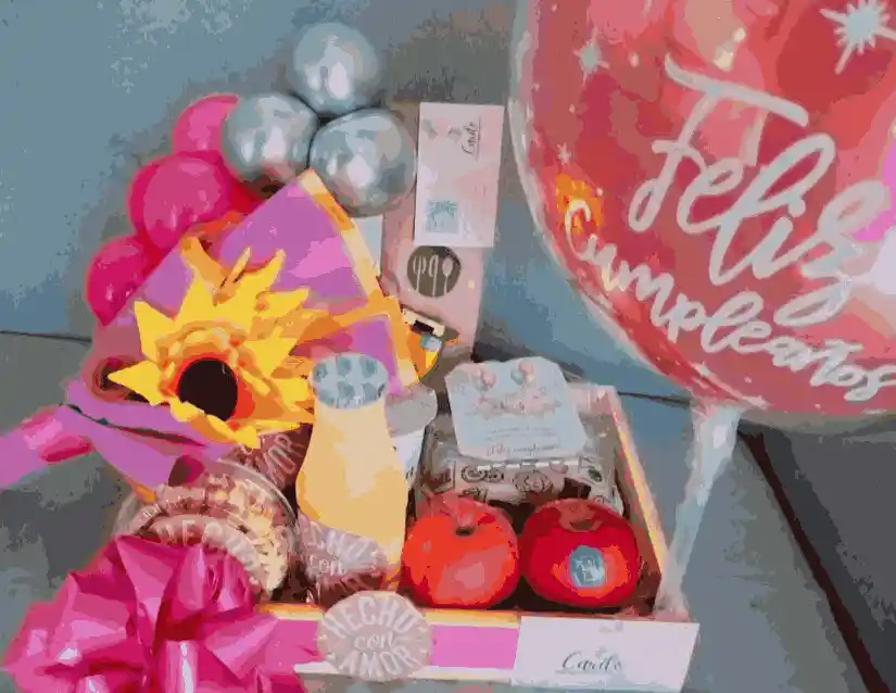 Contenido: 1 Jugo Natural de Naranja 2 Manzanas 1 Maní 2 Galletas Integrales 1 Porción de frutas 1 Sándwich jamón y queso 1 Mini Ramo de Girasoles 1 Decoración personalizada