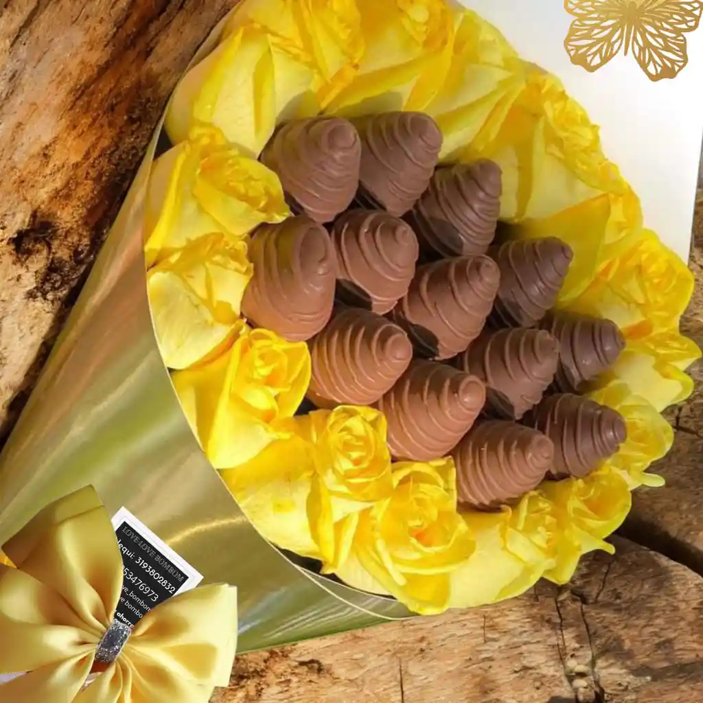 CHOCOFRESAS DECORADA X 123 Y ROSAS AMARILLAS X 15