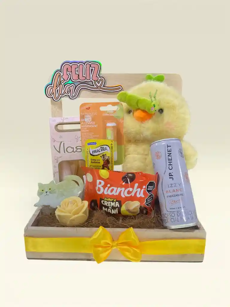 Esta ancheta tiene un estilo dulce, tierno y alegre, perfecta para un regalo especial. 🎁✨ incluye: • Peluche de pollito amarillo con un pequeño gusanito verde en el pico, que le da un toque muy tierno. • kit de vlasy pequeño (crema de manos y spalsh) • Bálsamo hidratante para labios marca Byphasse. • Chocolate Bianchi sabor crema de maní. • Nucita pequeña • Bebida JP Chenet Fizzy Blanc en lata. • vela en forma de rosa amarilla • gancho para el cabello en forma de gato