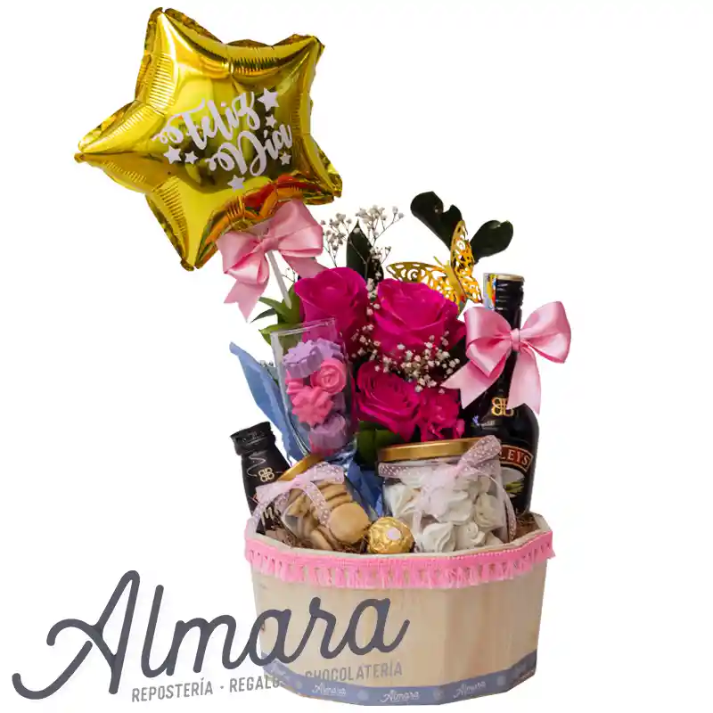 Anchetas y Canastas del día de la Madre 1 Globo de 9" Mensaje Feliz Día 1 Canasta 1 Arreglo floral 1 Ferrero 1 Mini Baileys 100ml 1 Frasco de mini alfajores 1 Frasco de merengues 1 Copa 1 Bolsa con 6 flores de chocolate blanco 1/2 Botellas de Baileys Color rosado Almara, Anchetas, chocolates caja rellenos,desayunos, perdón, sorpresas