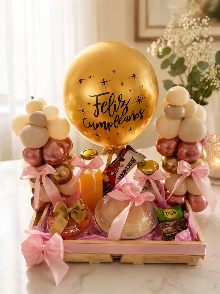 Bandeja de madera con decoración de cumpleaños CONTENIDO: Sanduche o pandebonitos Bebida Postre o parfait Fruta Dulce o galleta Tarjeta personalizada