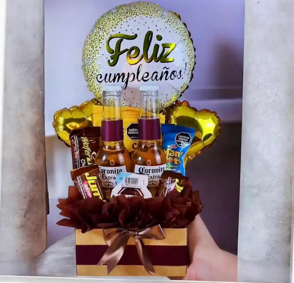 contiene 2 cervezas, coronita 1 gomas 1 Maní 1 Wafer jet 2 mini jumbo 1 nucita o nutela decoración Tarjeta personalizada