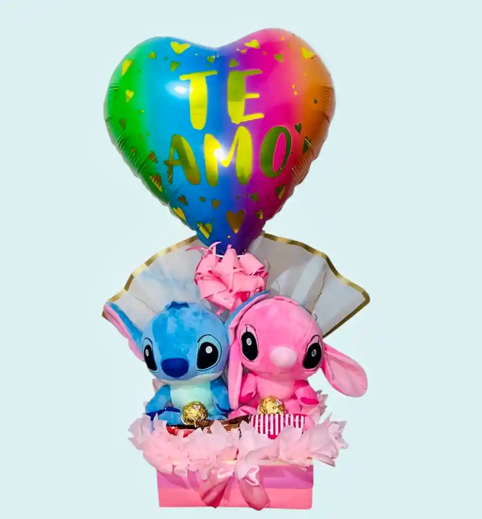 contiene 1 peluches stitch rosado 1 Peluches, Stitch azul Dulces 2 bolas de chocolates  ponky  Galleta bridge  mini snakys  galleta de chocolate  decoración Tarjeta personalizada